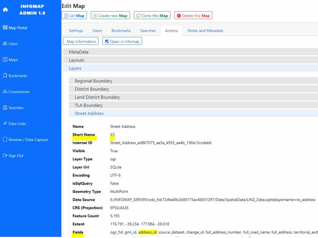 - Click on a layer that you want to query. You need to find the “Short Name” and a field under “Fields” e.g. Short Name X3, Field address_id