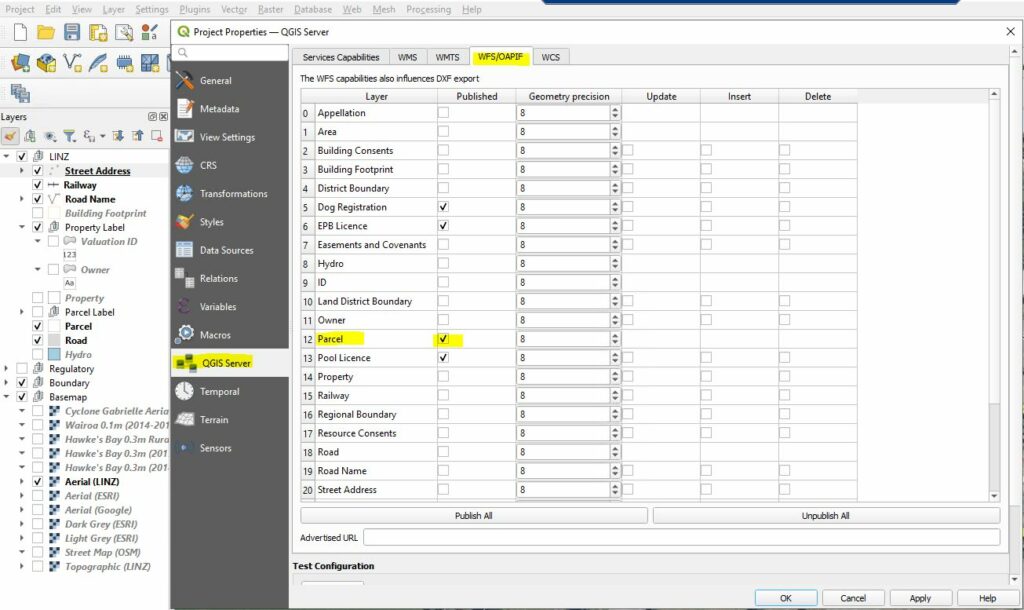Once you have created the URL you need to ensure that the layer that you want to select in a map is published as “WFS” in the QGIS Server Settings.